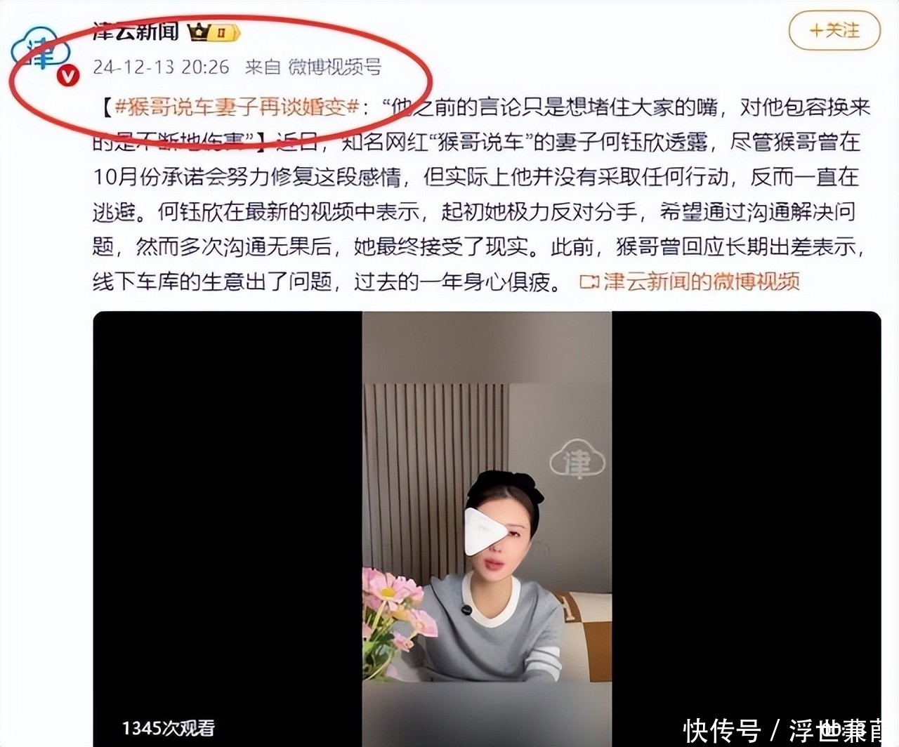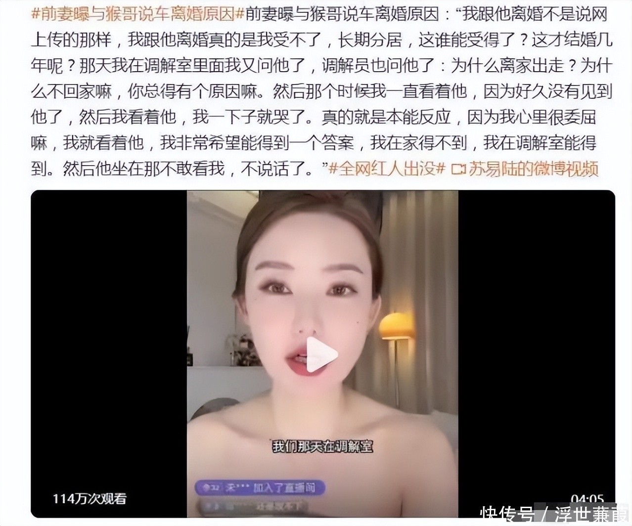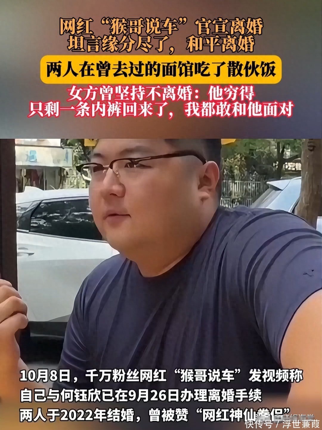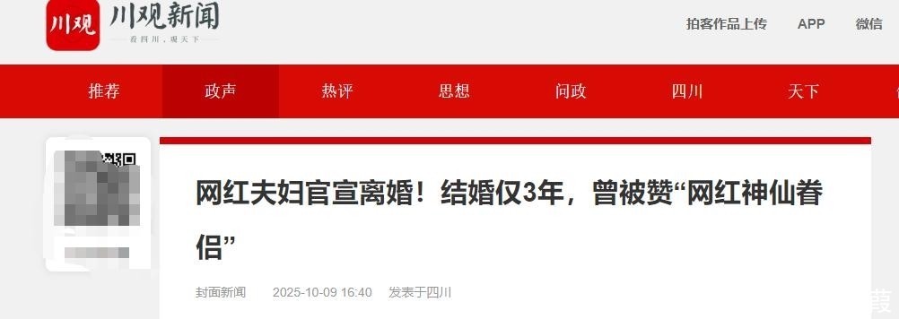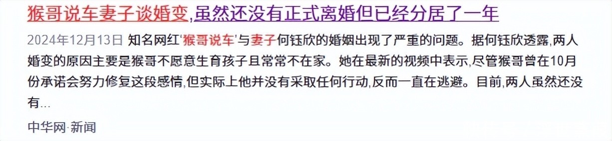 【参考文献】封面新闻 - 2025-10-09 ——《网红夫妇官宣离婚!结婚仅3年,曾被赞“网红神仙眷侣》津云新闻-2024年12月13日——猴哥说车妻子再谈婚变